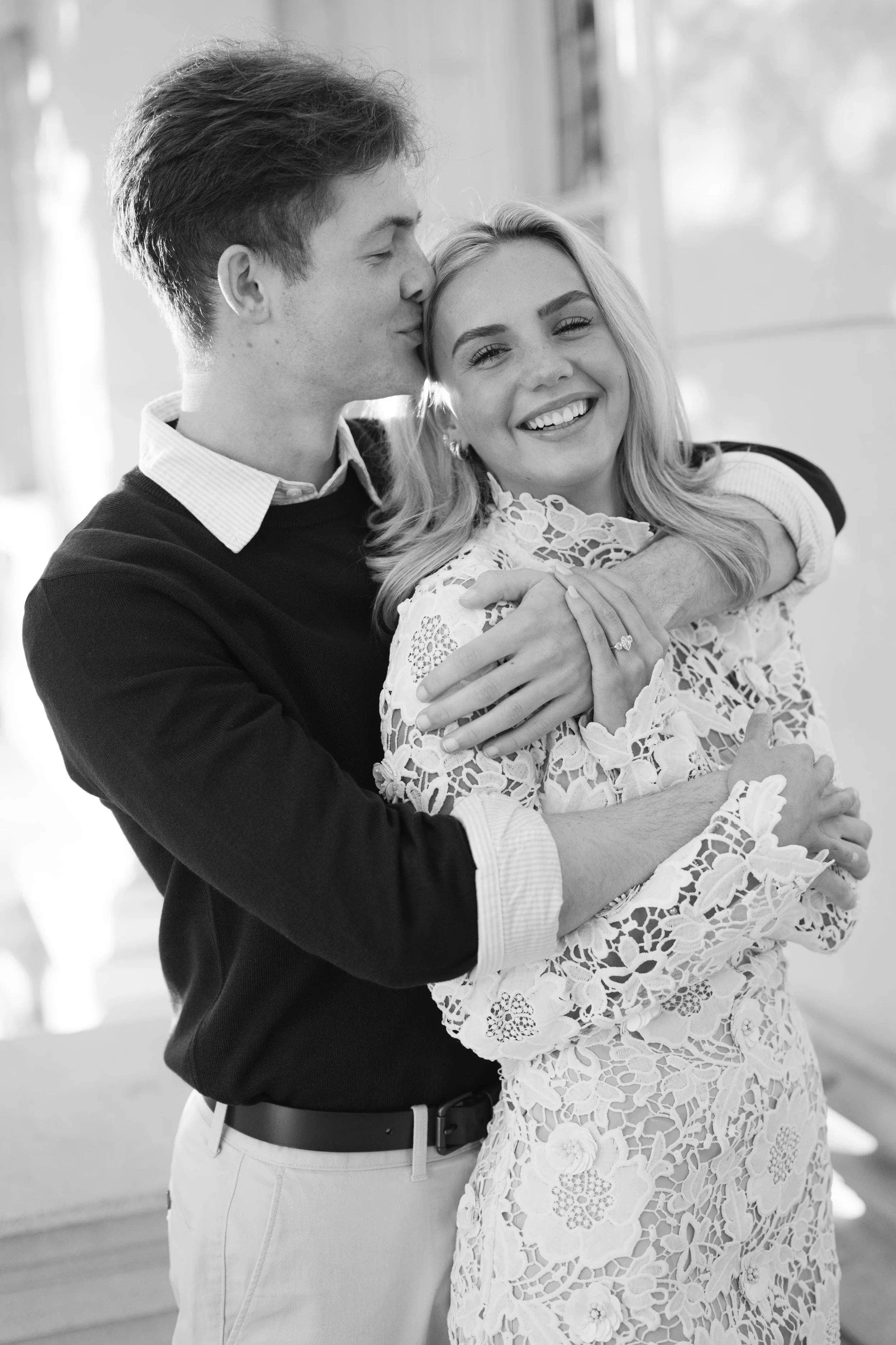 A black-and-white photo of a smiling woman in a lace dress being hugged by a man in a sweater, with the man kissing her on the forehead.