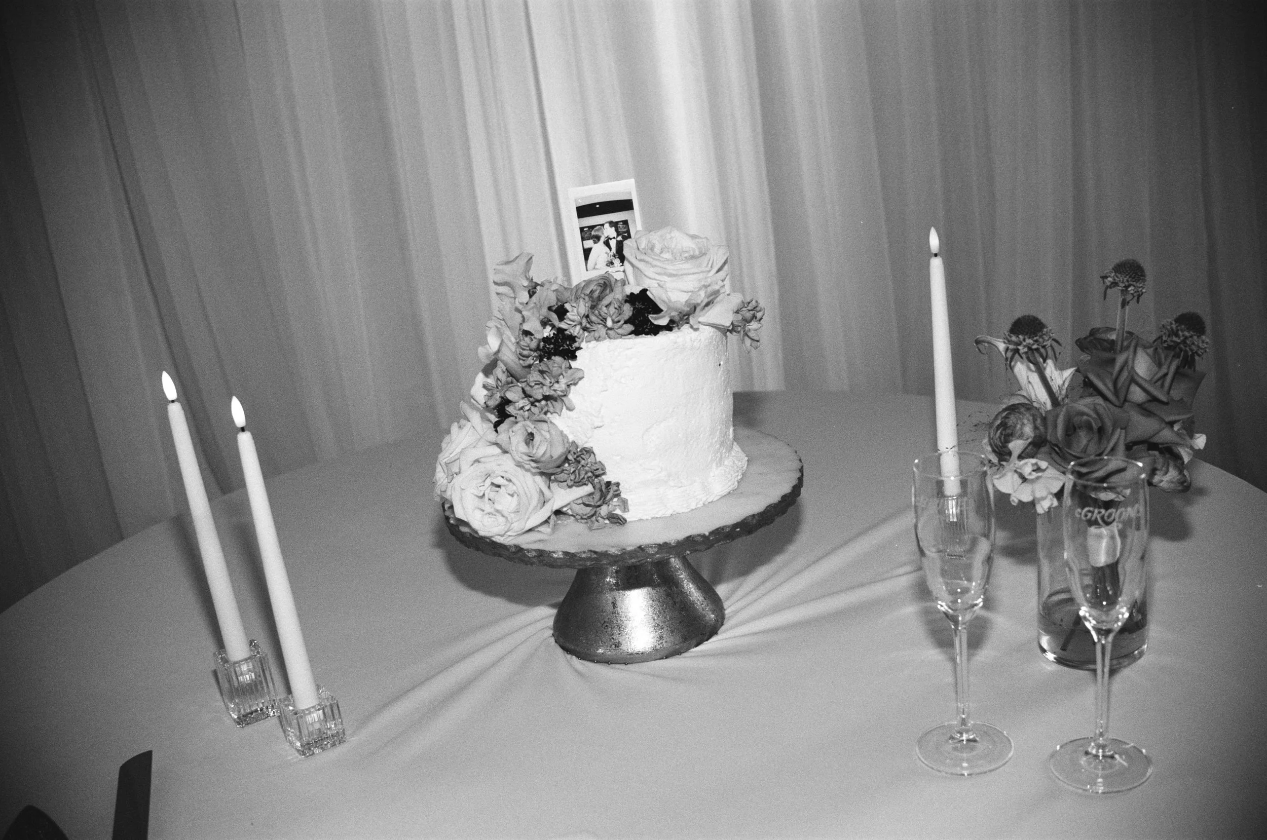 A wedding cake decorated with flowers, placed on a stand, with candles and floral arrangements nearby on a table.