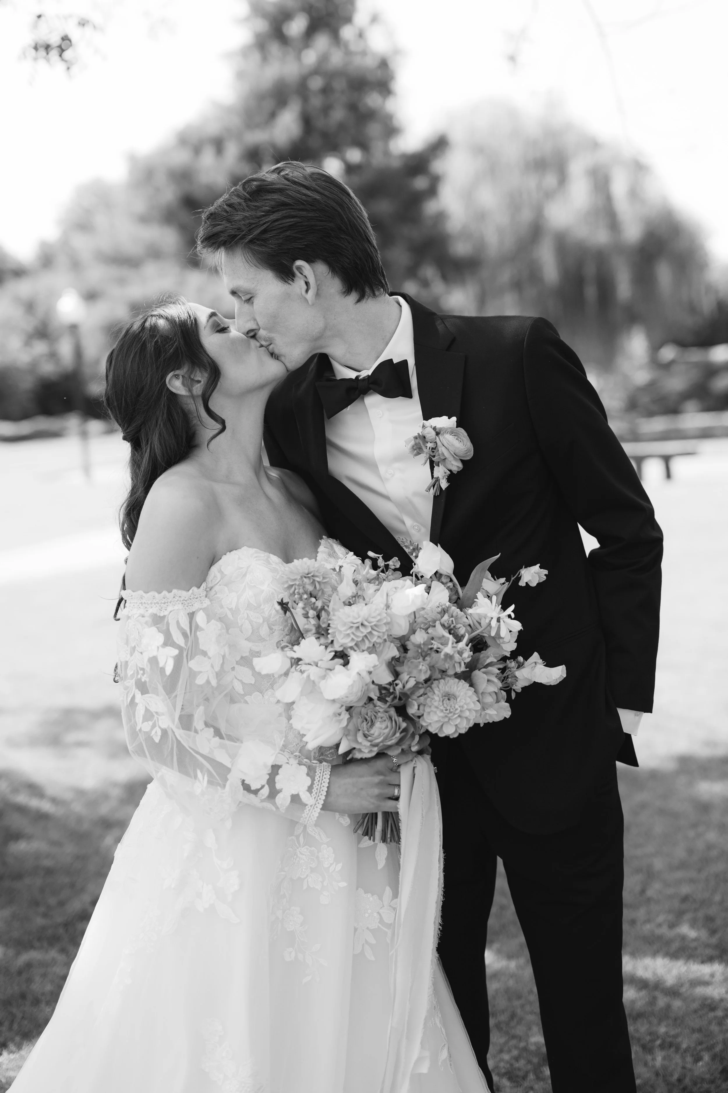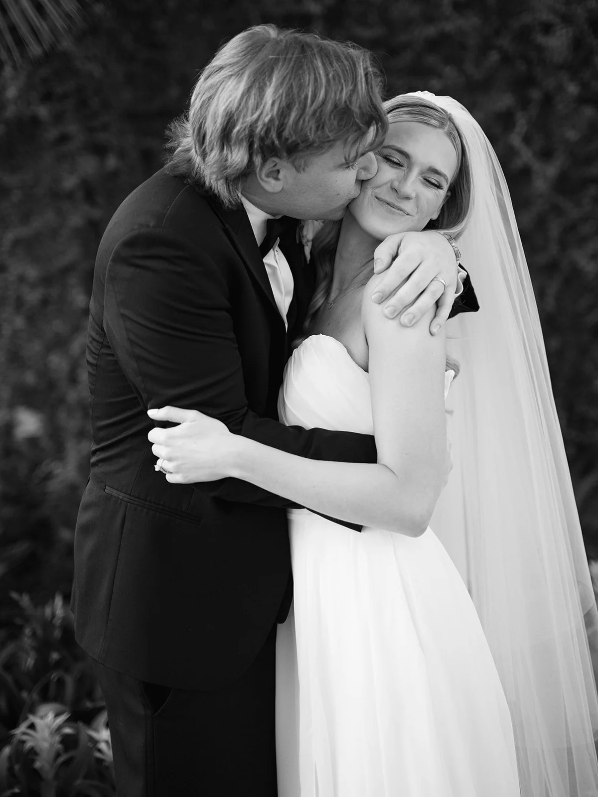 A black-and-white photo of a newlywed couple, with the groom kissing the bride on the cheek. They are hugging and smiling, with the bride wearing a wedding dress and veil, and the groom in a tuxedo.